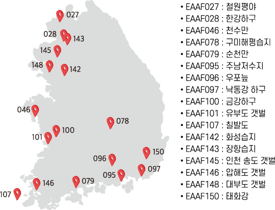 각각의 서식지는 국제적으로 중요한 이동성 물새 서식지 등재 기준을 충족하는 지역으로서, 이동 경로 내 국제적으로 중요한 이동성 물새 서식지는 1,000여개소 이상으로 알려져 있습니다.