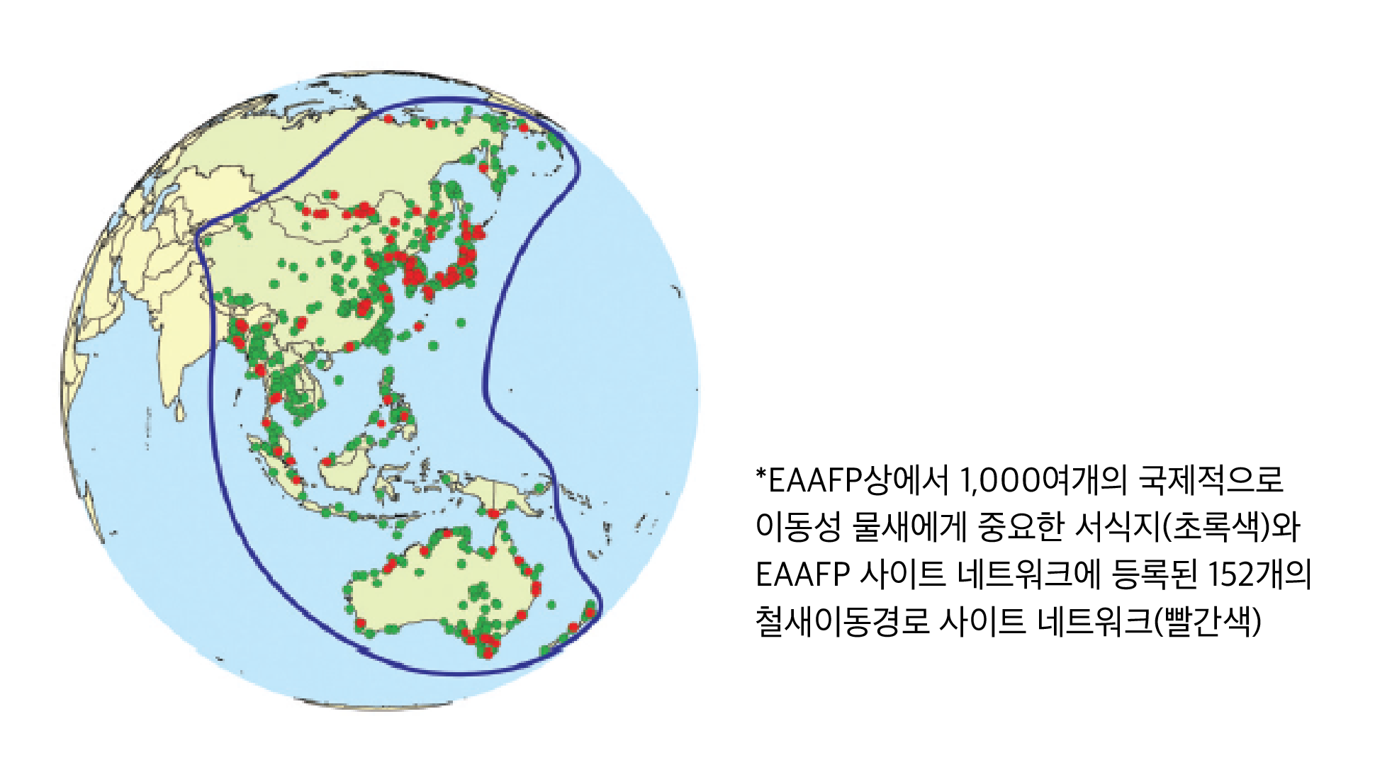 EAAFP 주요종에 대해 대한민국은 저어새와 검은머리갈매기(송도)의 번식지를 제공하고 있으며, 다양한 이동성 물새의 기착지이기도 하다.
