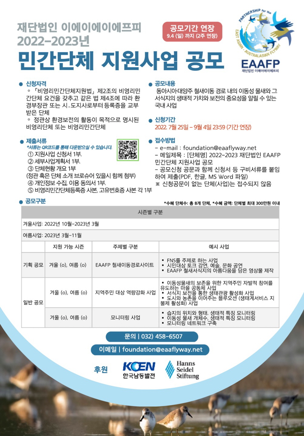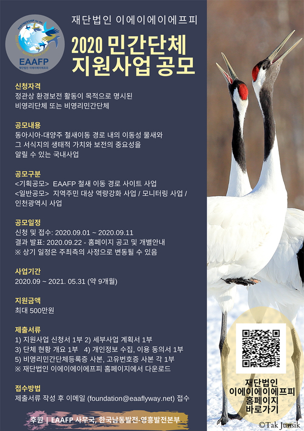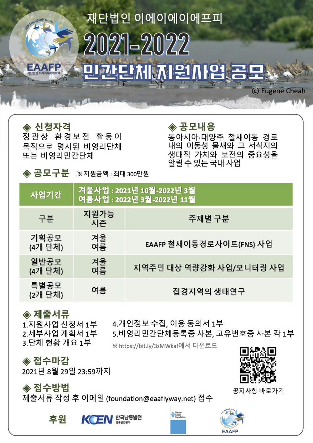 재단법인 이에이에이에프피의 민간단체 지원사업은 동아시아-대양주 철새이동경로 전반의 이동성물새와 그 서식지를 보전하기 위해 노력하는 비영리민간단체의