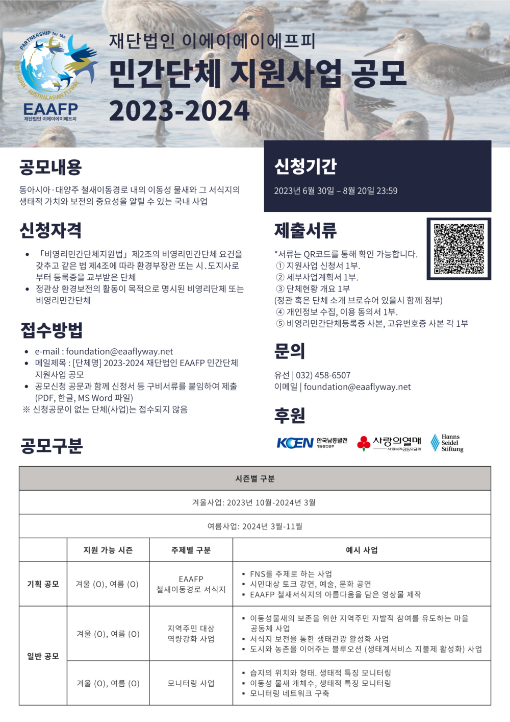 재단법인 이에이에이에프피의 민간단체 지원사업은 동아시아-대양주 철새이동경로 전반의 이동성물새와 그 서식지를 보전하기 위해 노력하는 비영리민간단체의 사업을 지원합니다. 공모주제는 다음 5가지 분야에서 예산과 여타 상황을 고려하여 매년 구체적으로 정해지게 됩니다.