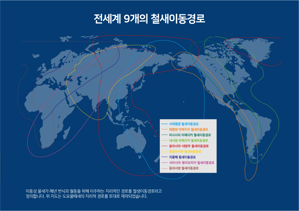 이동성 물새들이 매년 이동하는 지리적 경로를 ‘철새이동경로 (flyway)’ 라고 하며, 물새를 기준으로 볼 때, 전 세계적으로 9개의 주요 철새이동경로가 있습니다. 그 중 하나인 동아시아-대양주 철새이동경로 (EAAF)는 러시아의 극동지방과 미국의 알래스카로부터 동아시아, 동남아시아를 지나 호주와 뉴질랜드에 이르는 22개국을 지나는 경로입니다.